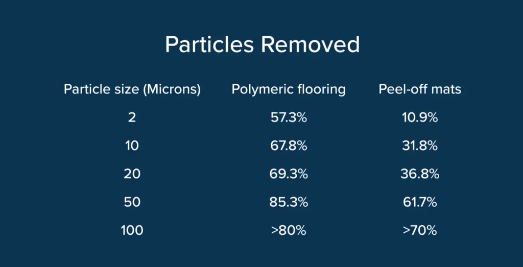 Společnost 3M uvádí, že 80 % nečistot je do budov vnášeno na podrážkách bot. Člověk, který kráčí rychlostí cca 3 km/h, může vytvořit 5 milionů částic za minutu (0,3 mikronu a větší), je to neuvěřitelně důležitý aspekt kontroly. Nejvýznamnější a nejpočetnější částice v kritických prostředích mají velikost menší než 10 mikronů (př. lidský vlas je mezi 50 a 150 mikrony s velikostí bakterií od 0,5 do 50 mikronů). Studie na Bath University v roce 1996 (odkazovaná Gerrym Proutem) zjistila, že strhávací fólie jsou relativně neúčinné ve srovnání s polymerním roztokem ve vztahu k zachycení částic menších než 50 mikronů.